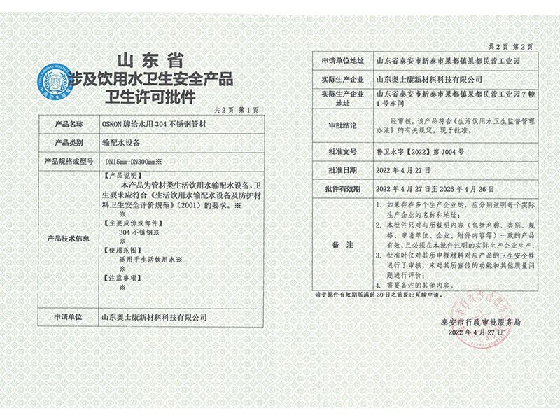卫生许可证(304-DN15-DN300)
